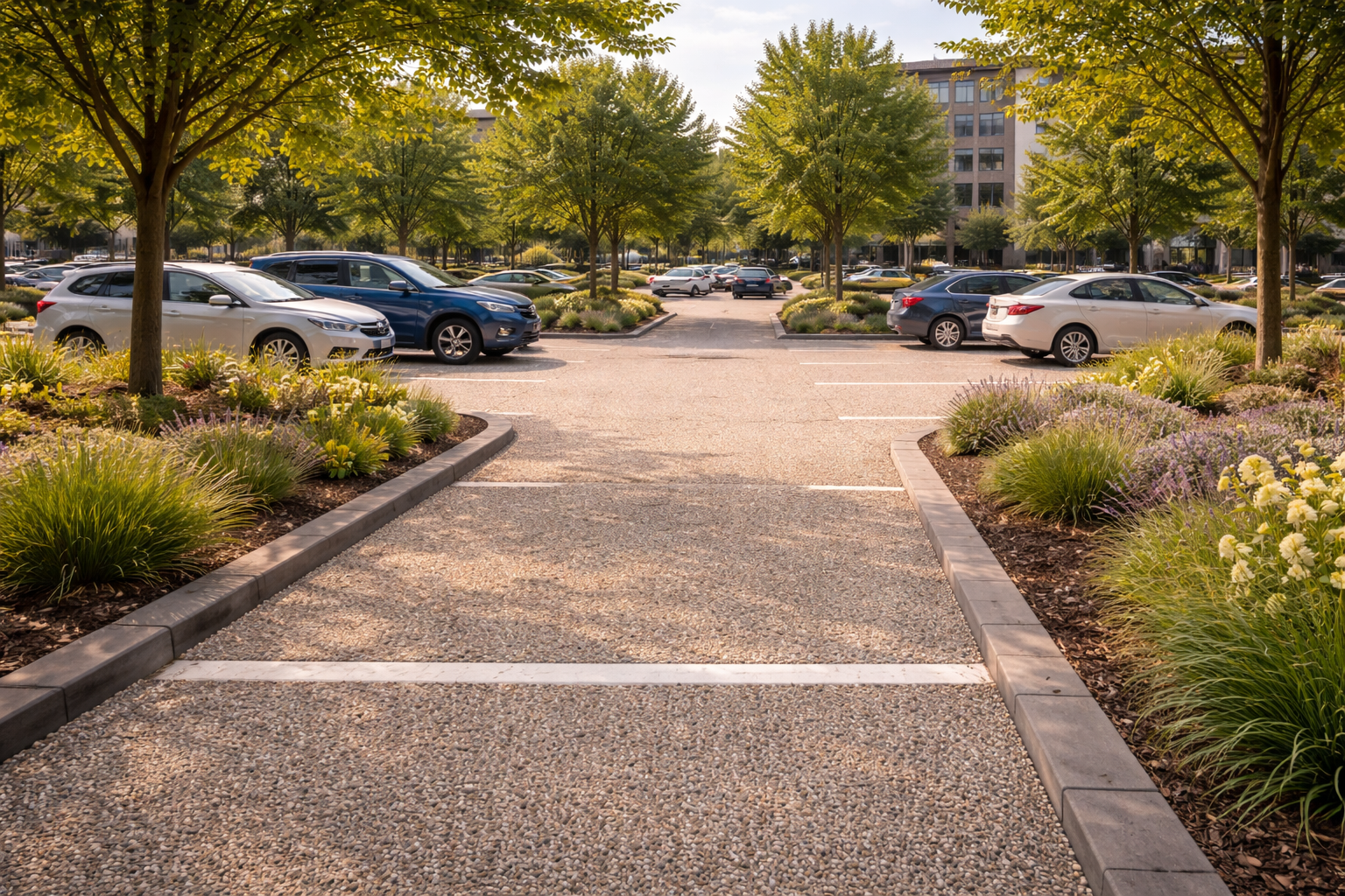 • Drenante e “green-friendly”: struttura drenante che gestisce l’acqua e, nelle aree verdi, permette di progettare soluzioni dove il verde è protagonista. Possibilità di integrare aree piantumate senza dover gestire il classico problema della spinta delle radici sul rivestimento, se correttamente progettato.
